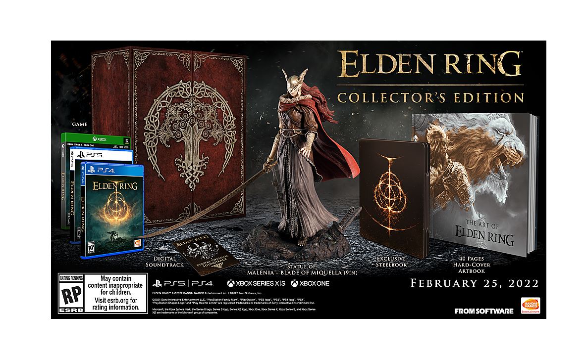 Pre-order Elden Ring Collectors Edition to get a Digital Adventure Guide and Bonus Gesture. Traverse the breathtaking world on foot or on horseback alone or online with other players and fully immerse yourself in the grassy plains suffocating swamps spiraling mountains foreboding castles and other sites of grandeur on a scale never seen before in a FromSoftware title. Preorder the collectors edition of Elden Ring and youll receive the game itself along with Statue of Malenia Blade of Miquella 9 inches.